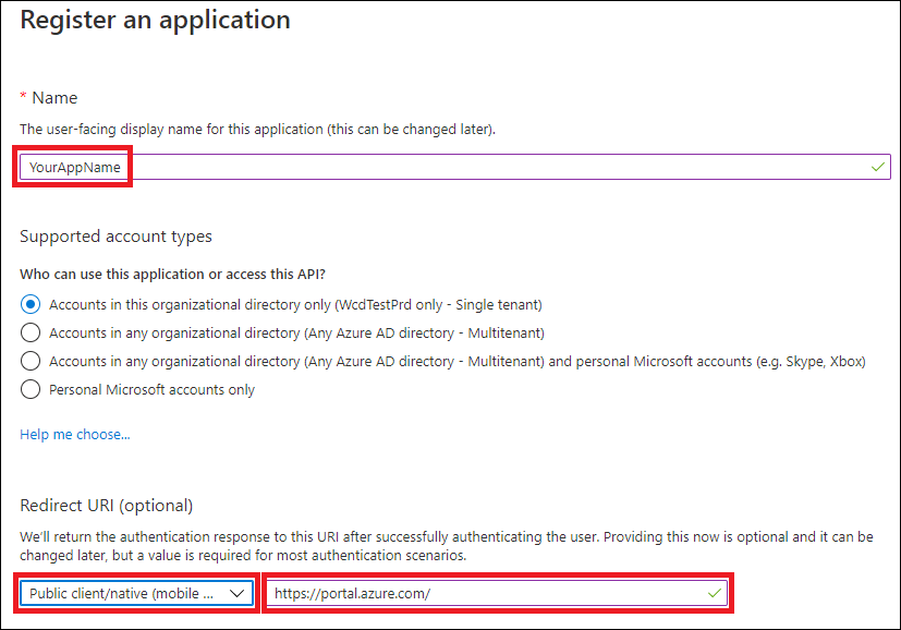 Velg et navn for programmet i skjemaet, og skriv inn følgende informasjon for omadresserings-URI-en, og velg deretter Registrer.