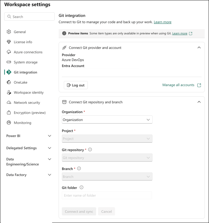 Hvis du velger Azure DevOps, velg Connect for automatisk å logge inn på Azure Repos-kontoen som er registrert på Microsoft Entra-brukeren som er logget inn i Fabric.
