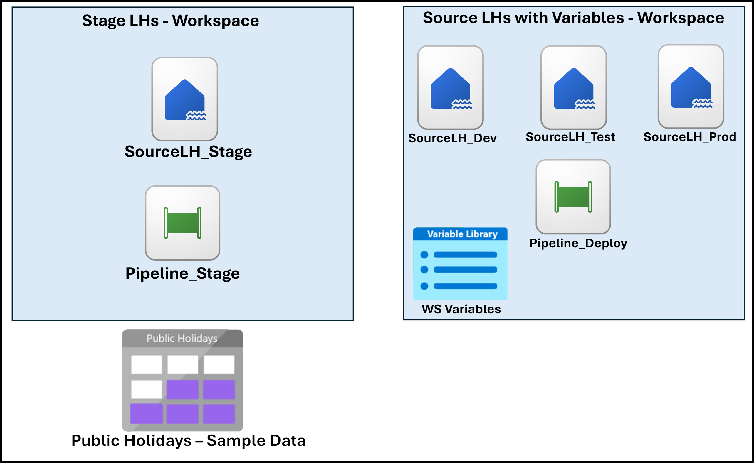 Denne opplæringen viser deg hvordan du bruker dynamisk innhold i Microsoft Fabric-datasamlebånd. Når du oppretter et variabelt bibliotekelement og legger til variabler i det, kan du automatisere verdier for ulike faser av distribusjonssamlebåndet. I denne opplæringen kopierer du data fra ett innsjøhus til et annet. Deretter bruker du variabelbiblioteket til å angi kilde- og målverdiene for kopieringsaktiviteten.