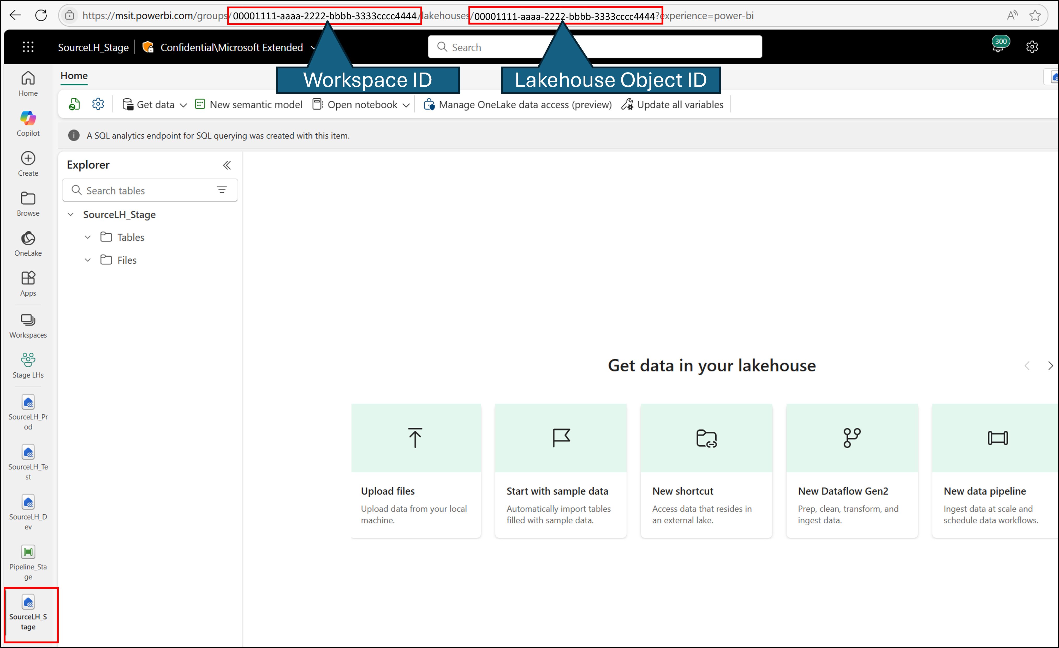 Kopier arbeidsområde-ID-en og lakehouse-objekt-ID-en i URL-adressen.