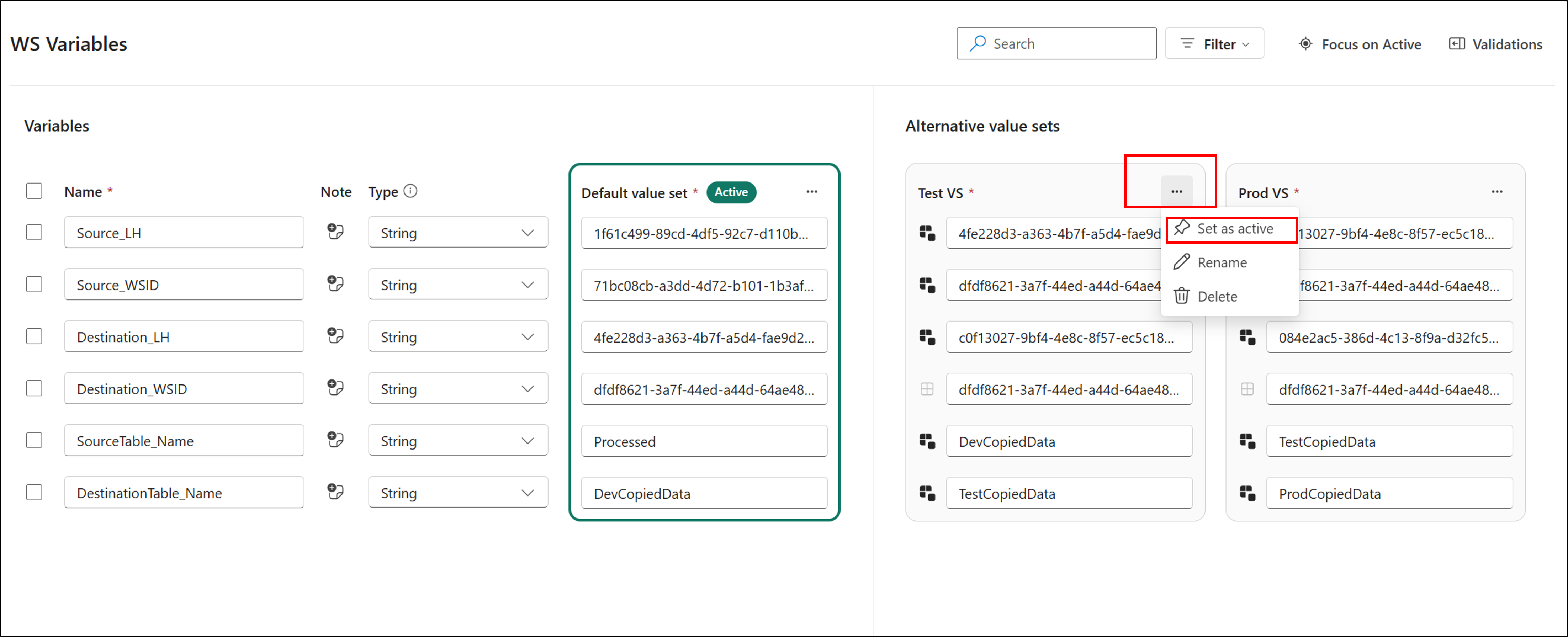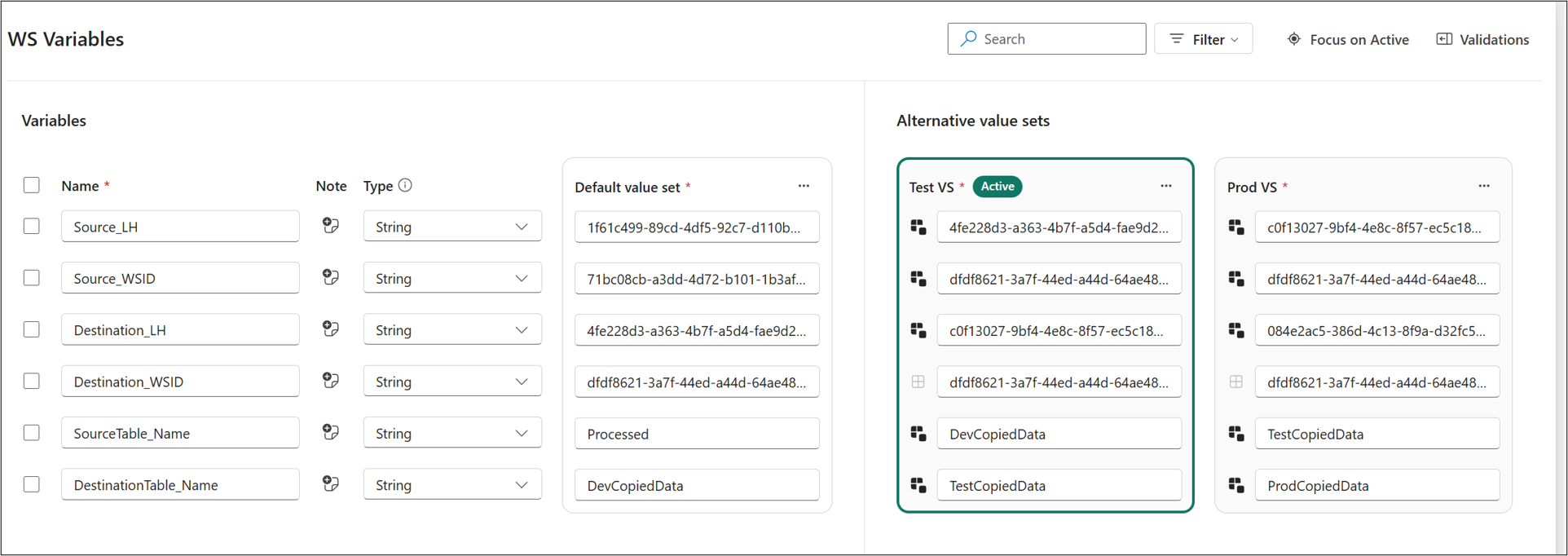 overrideser satt til de forskjellige verdiene. Du kan redigere disse verdiene direkte i brukergrensesnittet eller ved å redigere denne filen i Git og oppdatere den til arbeidsområdet.{ "$schema": "https://developer.microsoft.com/json-schemas/fabric/item/VariablesLibrary/definition/valueSets/1.0.0/schema.json", "valueSetName": "Test VS", "overrides": [ { "name": "Source_LH", "value": "4fe228d3-a363-4b7f-a5d4-fae9d2abca43" }, { "name": "DestinationTableName", "value": "TestCopiedData" } ] }{ "$schema": "https://developer.microsoft.com/json-schemas/fabric/item/VariablesLibrary/definition/valueSets/1.0.0/schema.json", "valueSetName": "Prod VS", "overrides": [ { "name": "Source_LH", "value": "c0f13027-9bf4-4e8c-8f57-ec5c18c8656b" }, { "name": "DestinationTableName", "value": "ProdCopiedData" } ] }