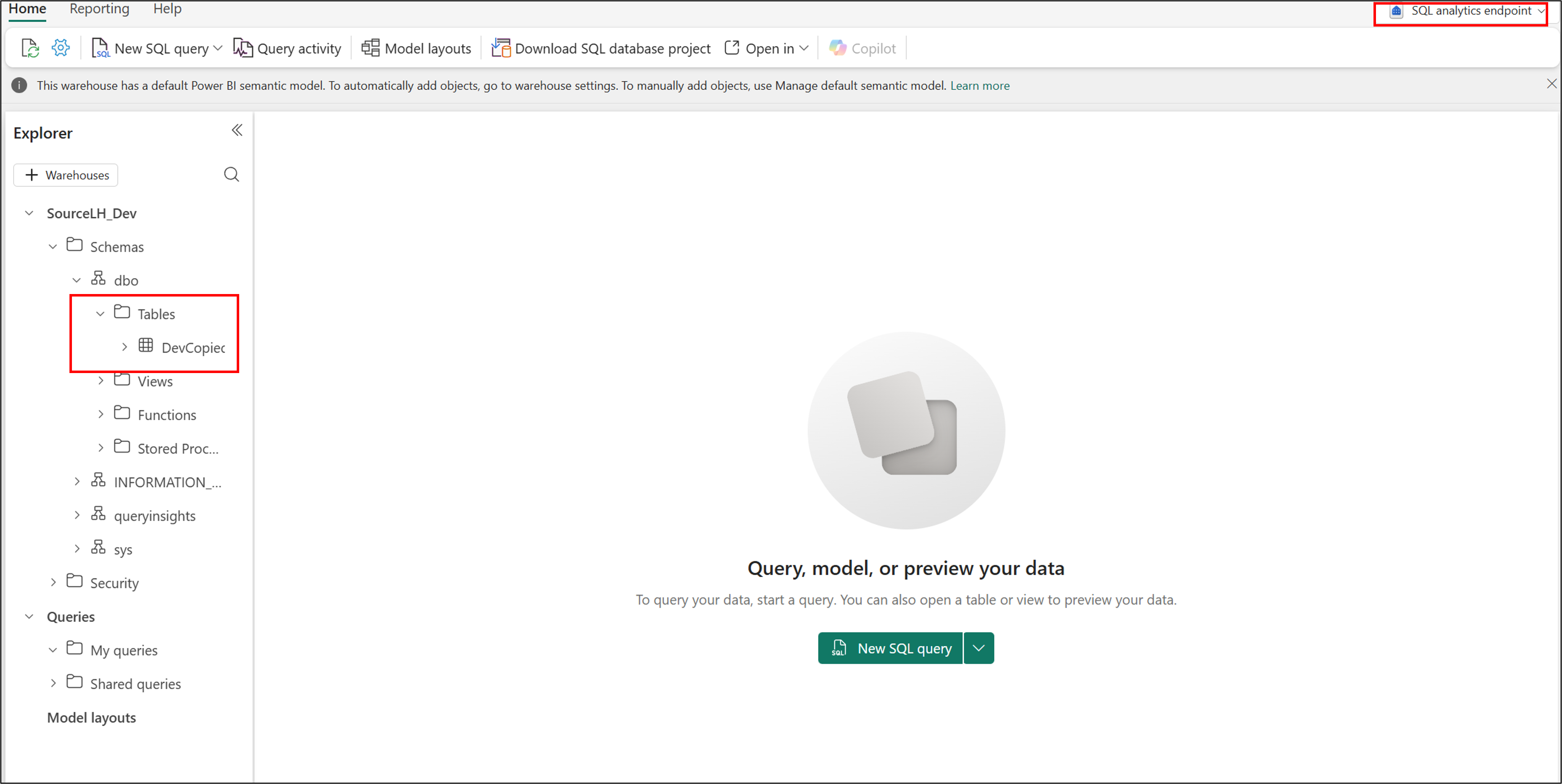Endre tilkoblingen fra Lakehouse til SQL Analytics-endepunkt.