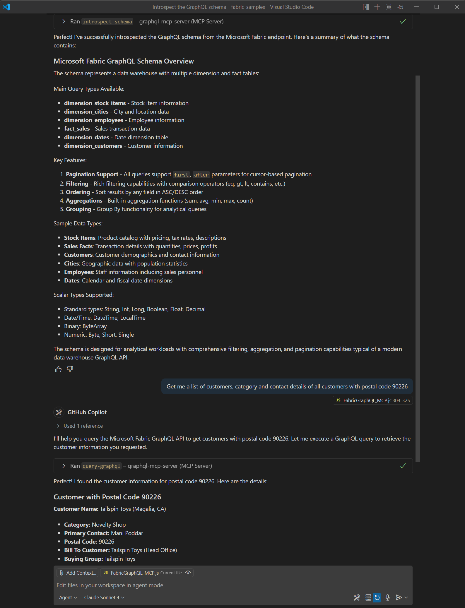 Hvorfor dette er viktig: Det er her alt faller på plass. Når de er koblet til, kan AI-agentene dine oppdage Fabric-skjemaet ditt gjennom introspeksjon og generere GraphQL-spørringer basert på forespørsler fra naturlig språk. AI-en håndterer spørringssyntaksen – du stiller bare spørsmål på vanlig engelsk.