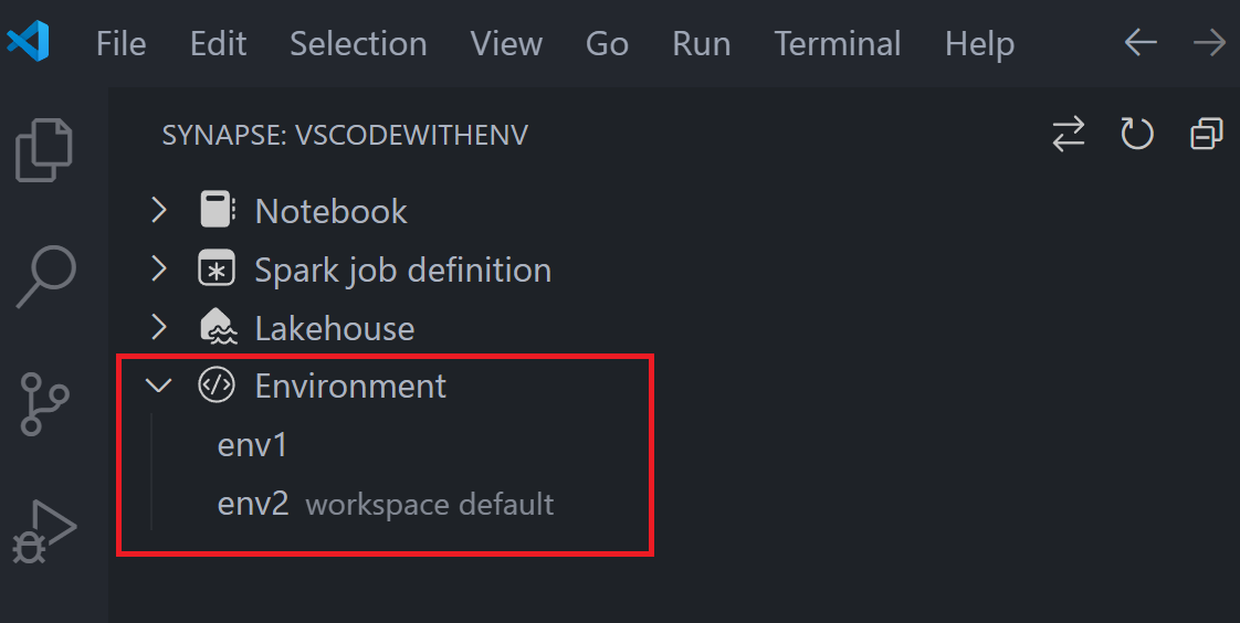 Når et miljø er opprettet, kan du utforske og undersøke det i Visual Studio (VS) Code med utvidelsen Fabric Data Engineering VS Code. En ny node kalt Miljø er tilgjengelig i VS Code. Utvid Miljøer-noden for å se alle miljøene i arbeidsområdet.