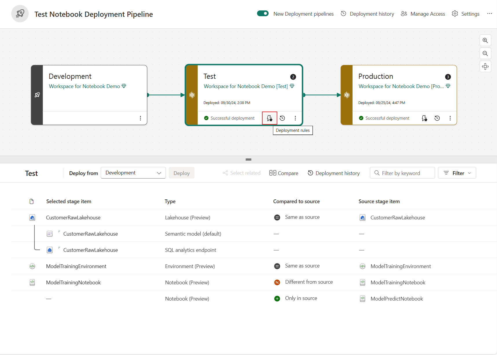 Notebook-distribusjon støtter automatisk binding for standard lakehouse og tilknyttet miljø når avhengige elementer er i samme arbeidsområde. Under utrulling kan Fabric binde disse avhengighetene på nytt til tilsvarende elementer i målarbeidsområdet. Metadataendringer kan vises i differensialvisningen.