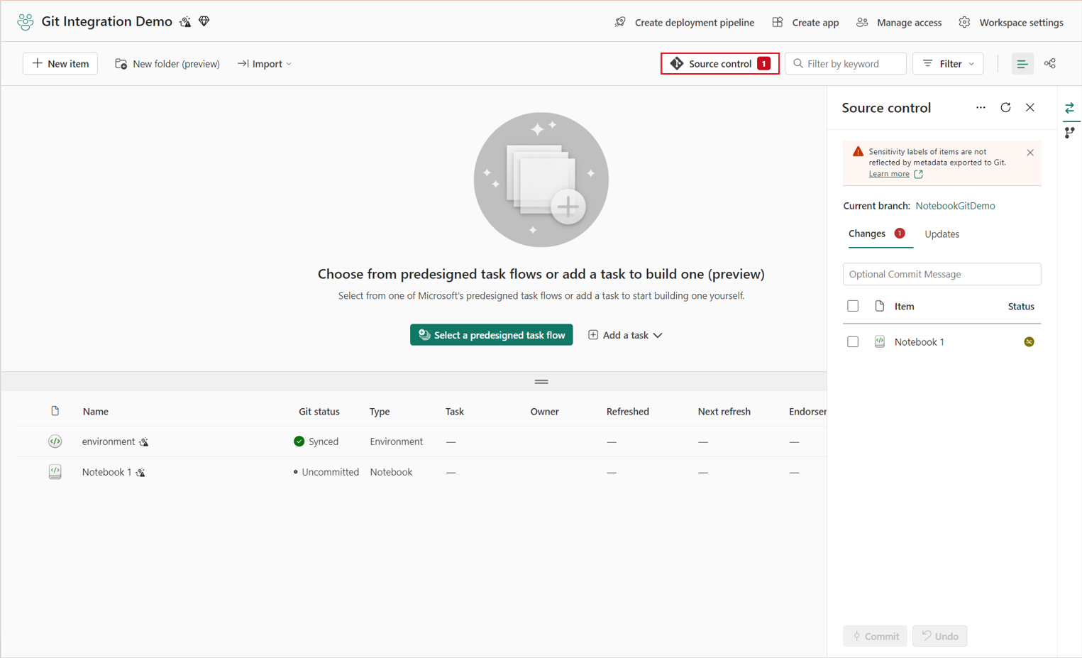 - Koble arbeidsområdet ditt til Git før du fullfører kildekodekontroll-trinnene for notatboken. For oppsettsinstruksjoner, se Kom i gang med Git-integrasjon.
