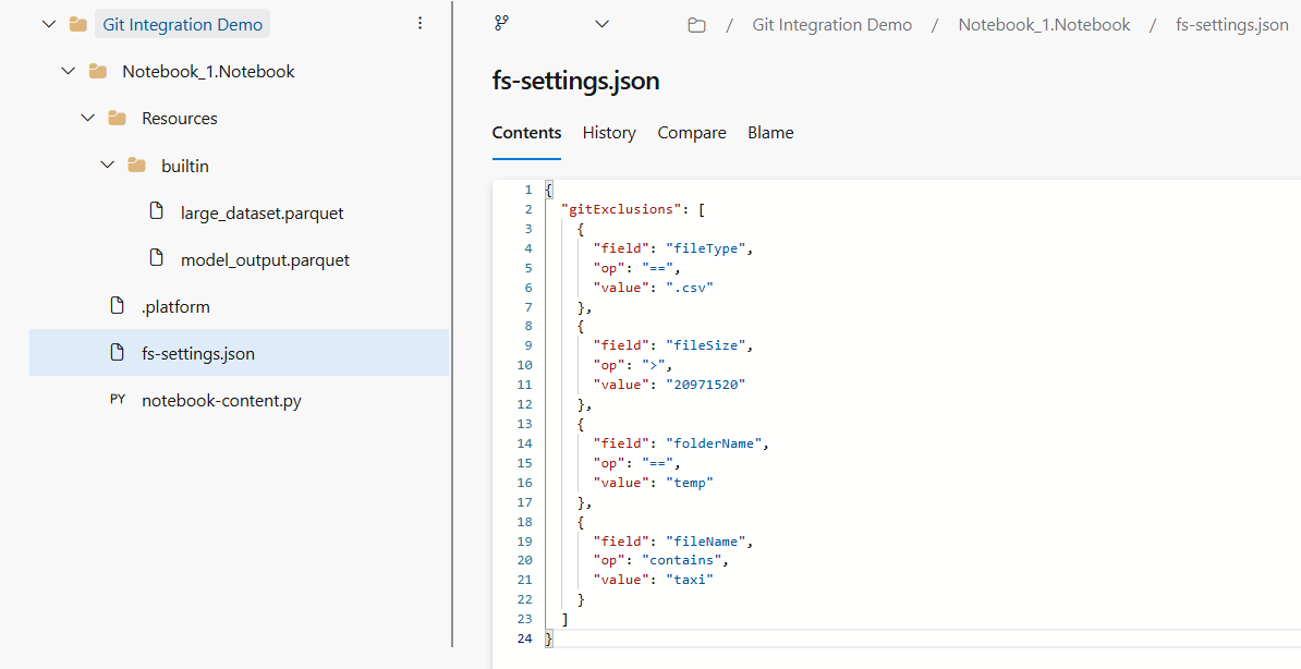 Etter at du har konfigurert Git-regler og kommittert endringer, lagrer Fabric reglene fs-settings.json i repositoriet. Fabric genererer og administrerer denne filen for å holde repository-konfigurasjonen konsistent. Vi anbefaler heller ikke å redigere denne filen direkte i Git-repositoriet.