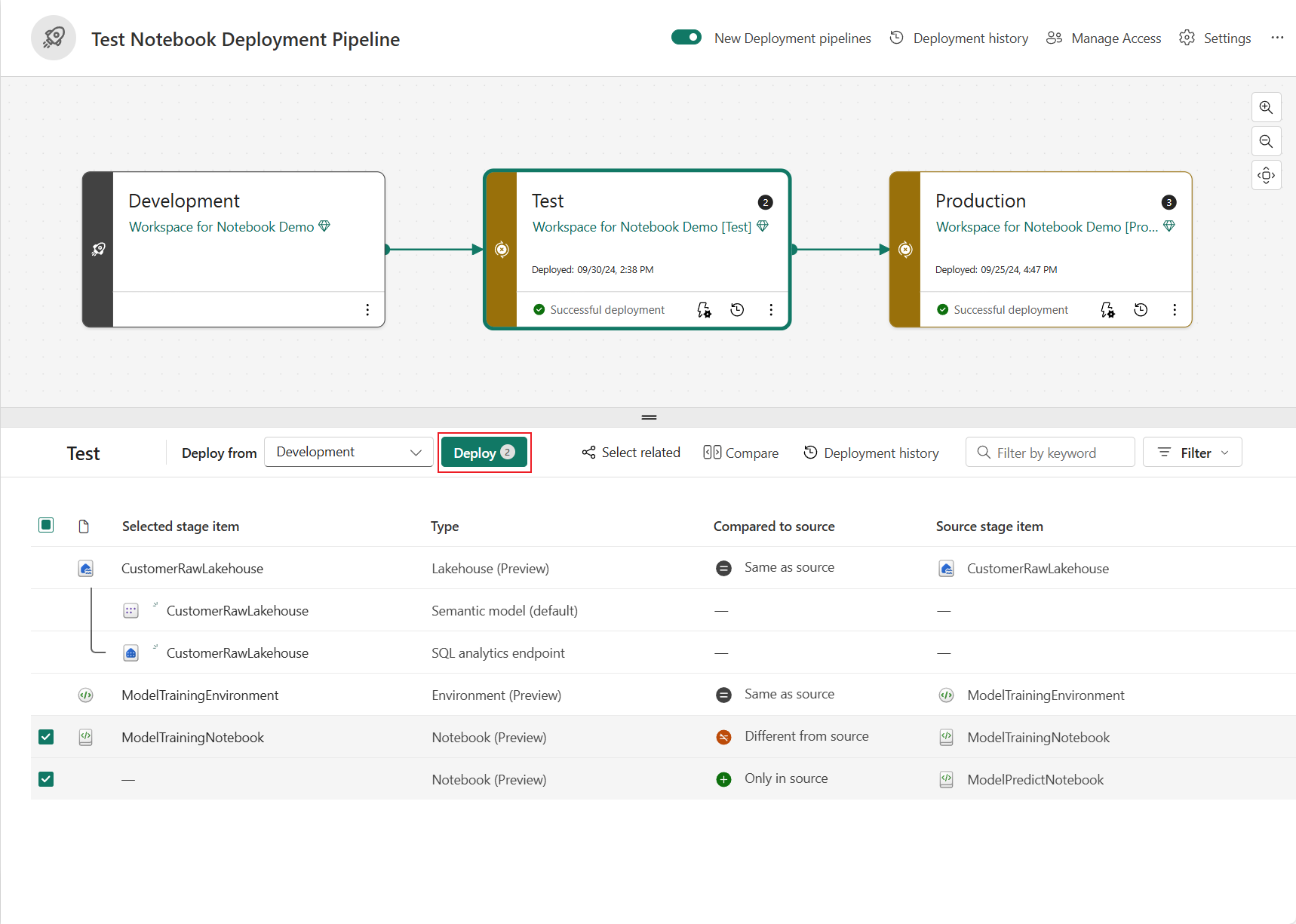 Velg Deploy for å promotere notatbøker på tvers av utviklings-, test- og produksjonsfasene .