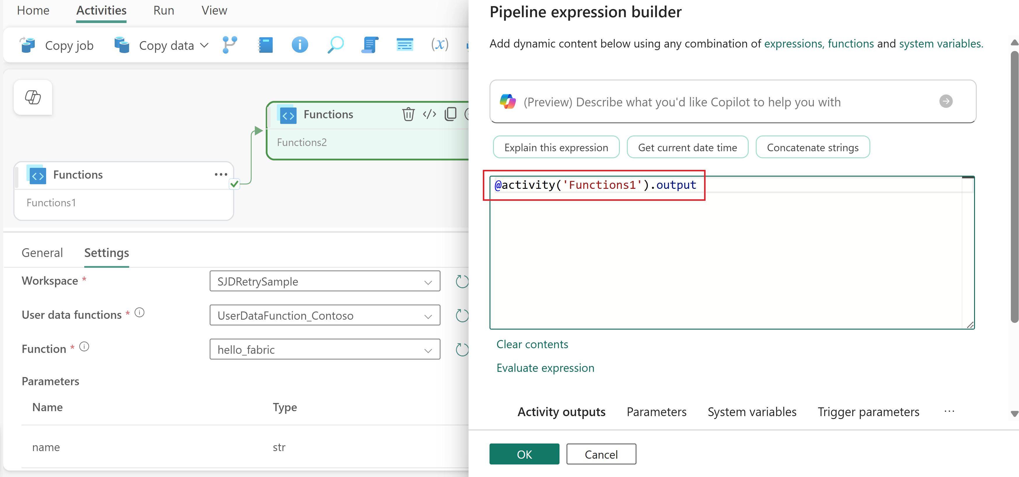 @activity('YourFunctionActivityName').outputfor å referere funksjonens returverdi. For eksempel erFunctions1navnet på funksjonsaktiviteten , som du kan bruke@activity('Functions1').outputfor å referere til utdata.