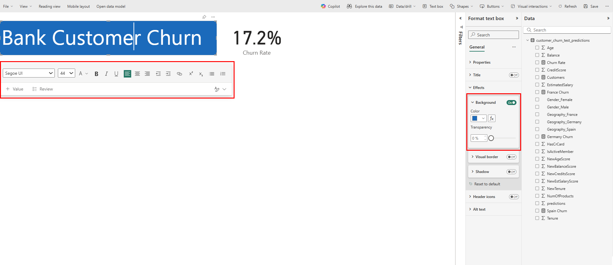 Spain Churn = CALCULATE(AVERAGE(customer_churn_test_predictions[predictions]),FILTER(customer_churn_test_predictions, customer_churn_test_predictions[Geography_Spain] = TRUE()))Frankrikes churn rate: