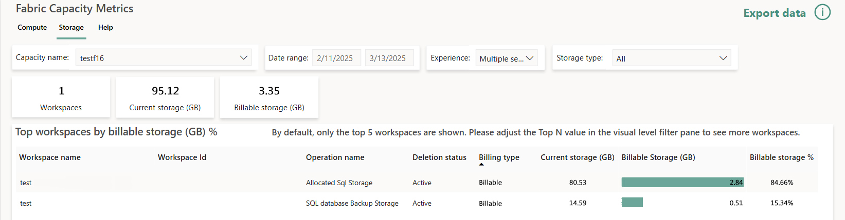 Rapportering av lagringsutnyttelse skjer på arbeidsområdenivå. Hvis du vil ha mer informasjon om lagringsbruk i databasen, kan du se Ytelsesinstrumentbord for SQL-database i Microsoft Fabric.