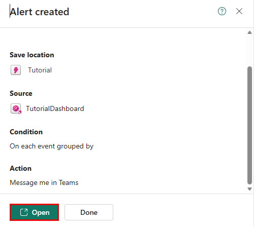 Felt Verdi Detaljer Regelnavn Varsel om høyt antall sykler Skjerm Kjør spørring hver 5 minutter Betingelse Sjekk På hver øvelse gruppert etter* Grupperingsfelt No_Bikes når BikepointID Betingelse Er større enn Verdi 30 Forekomst Hver gang betingelsen er oppfylt Handling Velg handling Melding til enkeltpersoner Hvis du vil Ditt Teams-brukernavn Overskrift Aktivatorvarsel Høyt sykkelantall Varsel Merknader Betingelsen for 'høy sykkelantallsalarm' er oppfylt Lagre plassering Arbeidsområde Arbeidsområdet hvor opplæringsressursene befinner seg Vare Opplæringen Velg Opprett. Når du ser suksessmeldingen, velg Åpne.