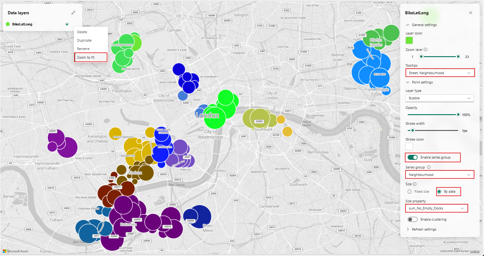 Høyreklikk på BikeLatLong under Datalag og velg Zoom for å passe for å zoome inn i London-området som viser sykkelstasjoner på kartet.