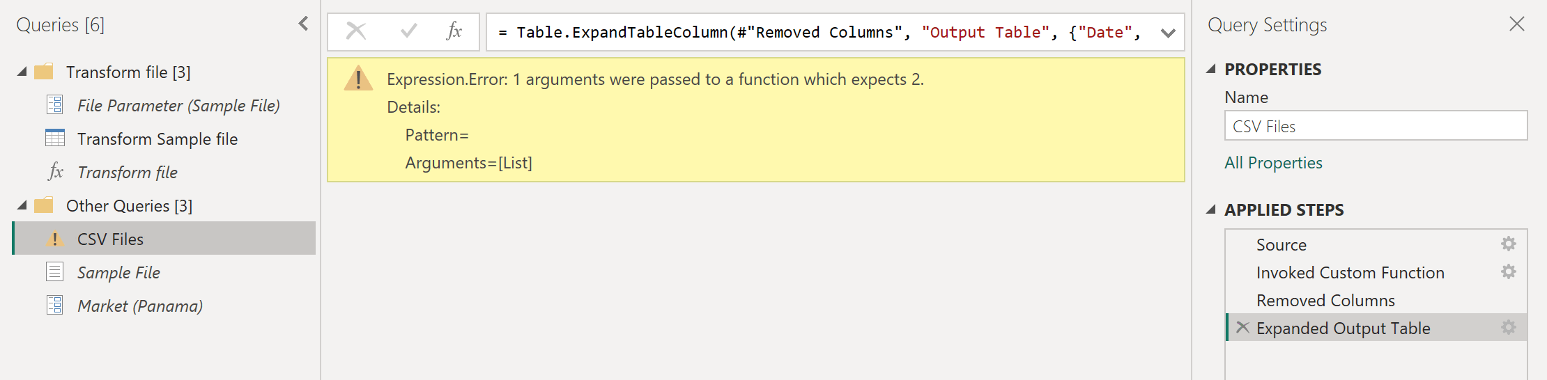 Men CSV-filspørringen har et advarselsskilt ved siden av. Nå som funksjonen din er oppdatert, krever den to parametere. Så steget hvor du kaller funksjonen resulterer i feilverdier, siden bare ett av argumentene ble sendt til Transform-filfunksjonen under steget Invoked Custom Function.