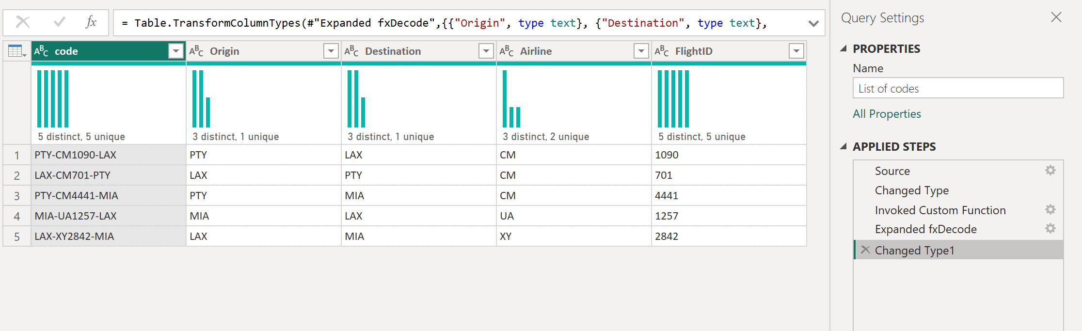#"Changed Type" = Table.TransformColumnTypes(RowToTable,{{"Origin", type text}, {"Destination", type text}, {"Airline", type text}, {"FlightID", type text}})