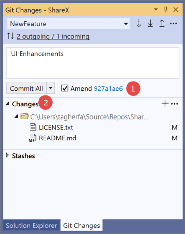 1. Click the Actions drop-down. 2. Select Amend Previous Commit. |