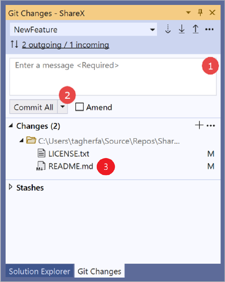 1. Enter a commit message. 2. Select Commit All. 3. To stage specific files, hover over them, and then click the “+” icon. |