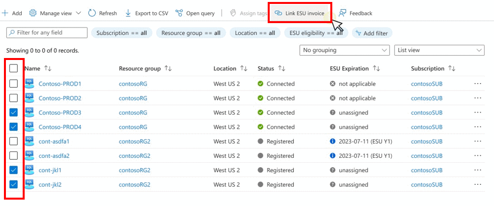 Follow these steps to link an ESU invoice to your Azure Arc SQL Server instances to get access to extended updates. This example includes both Connected and Registered servers.