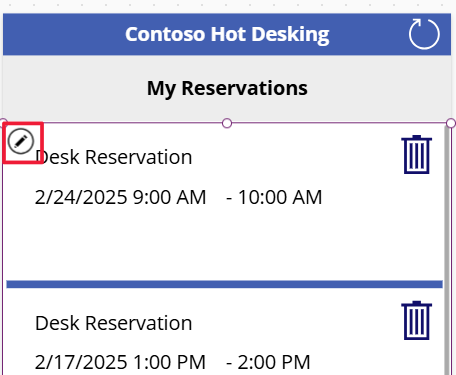 LookUp(Users,'Primary Email'=currentUserEmail).'Reservations (contoso_Reservation_ReservedFor_SystemUser)'Select the edit gallery icon.