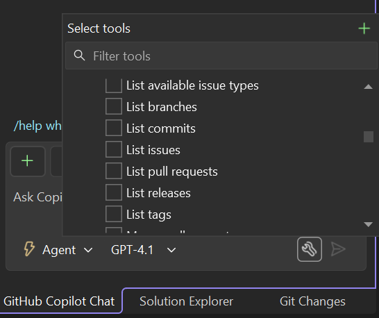- When Visual Studio successfully enables the server, the agent makes the tools available. The tools are disabled by default and you must manually enable them.