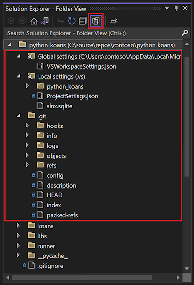 When you open a Python folder, Visual Studio creates several hidden folders to manage settings related to the program. To see these folders (and any other hidden files and folders, such as the .git folder), select the Show All Files toolbar option: