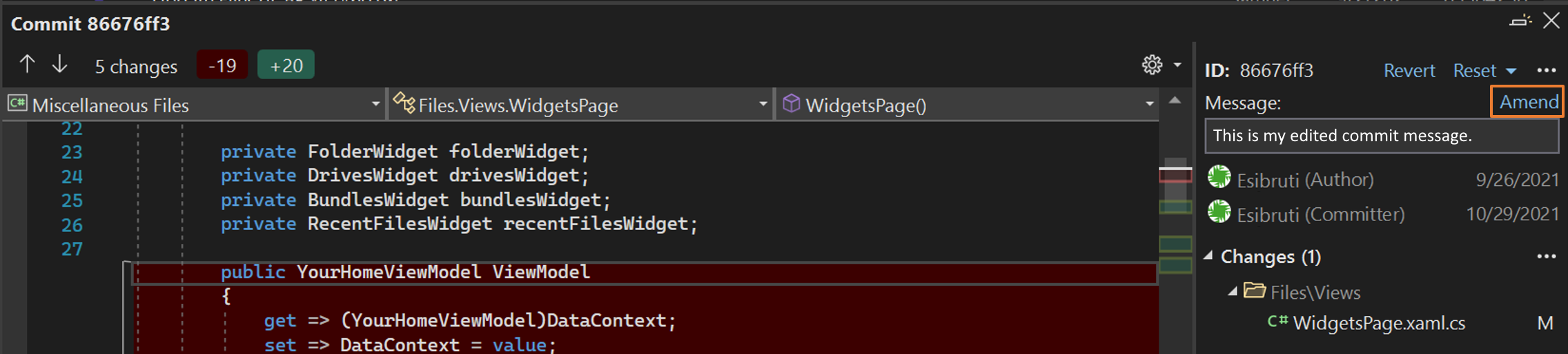 When you finish editing your commit message, select Amend.