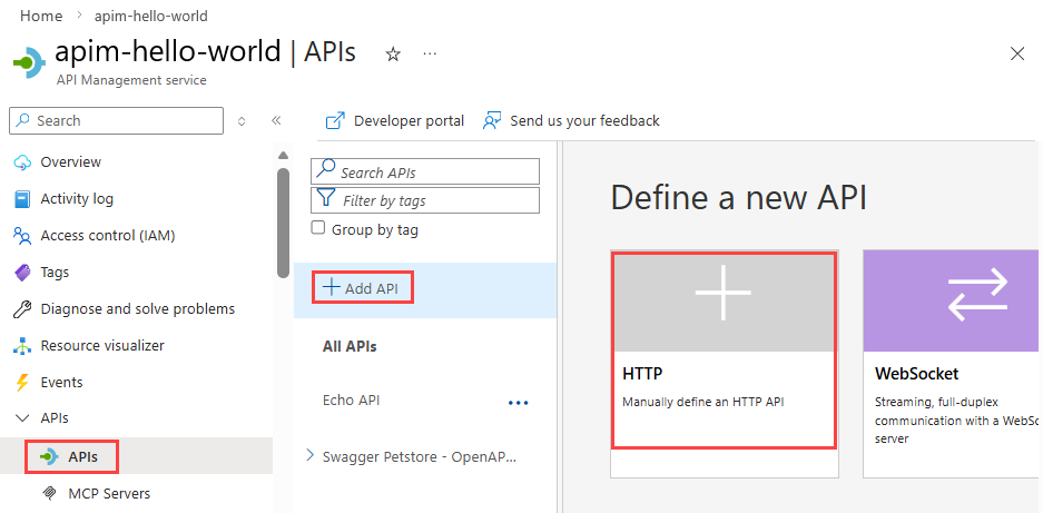 No menu da barra lateral, selecione APIs>e, em seguida, selecione + Adicionar API. Escolha o tile HTTP:
