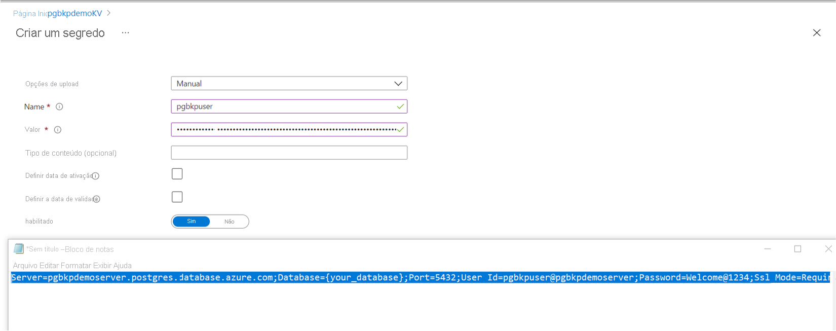 O segredo é a cadeia de conexão do servidor do Banco de Dados do Azure para PostgreSQL no formato ADO.NET. Ele é atualizado com as credenciais do usuário do banco de dados que concedeu os privilégios de backup no servidor.