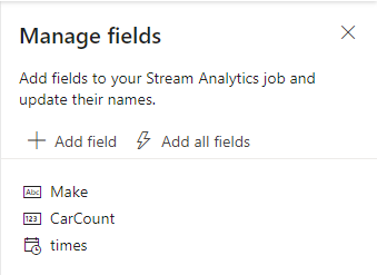 Em alguns segundos, você verá dados de entrada de exemplo e o esquema. Você pode optar por remover campos, renomear campos ou alterar tipos de dados.