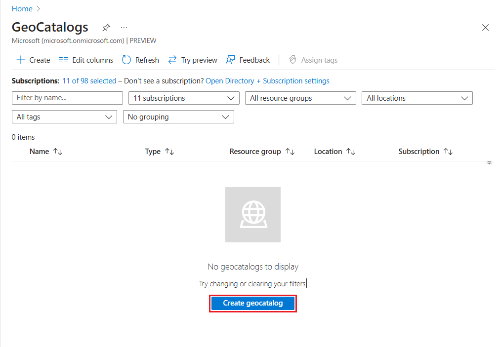 Inicie o processo de criação do GeoCatalog por 1) selecionando o botão Criar no canto superior esquerdo da tela ou 2) selecionando o botão Criar catálogo geográfico no centro inferior da tela. O botão Criar geocatalog não aparecerá se você tiver um ou mais GeoCatalogs existentes.