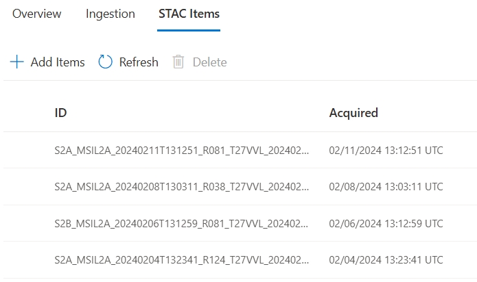 Quando a execução de ingestão é concluída, a guia itens STAC em sua coleção exibe sua lista de itens STAC que foram ingeridos, com colunas para a ID do item e a data de aquisição.