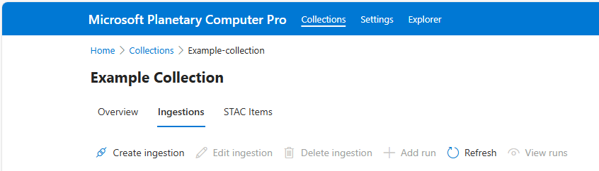 Quando você fornece uma fonte de ingestão, como um contêiner de armazenamento de blobs ou URL pública, o Planetry Computer Pro pode acessar seus dados. Você pode ingerir coleções STAC, itens STAC e ativos armazenados no local especificado no Computador Planetário Pro. O recurso GeoCatalog deve ter acesso ao JSON da coleção STAC e aos ativos geoespaciais (imagens, dados etc.) que os itens STAC da coleção STAC apontam.