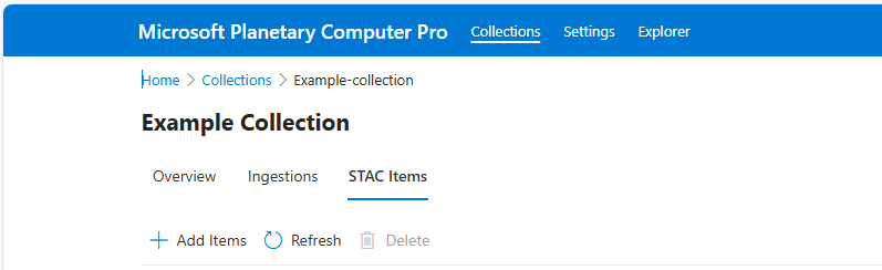Considerando uma coleção STAC pré-existente em um GeoCatalog, os usuários podem ingerir novos ou atualizar itens STAC existentes e seus ativos associados usando a interface web do Planetry Computer Pro ou a API. Em contraste com o recurso ingestão em massa do Computador Planetário Pro, a ingestão de Item Único destina-se a importações ou atualizações de baixa latência versus migrações de dados grandes. Para obter mais informações sobre a ingestão em massa, consulte Adicionar itens STAC a uma coleção.
