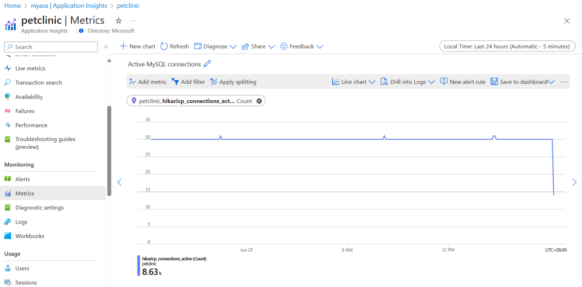 Essa seção mostra como usar métricas com seu aplicativo e monitorar as métricas em um painel do Azure usando os gráficos das principais métricas gerados pelos Aplicativos Spring do Azure e pelo Application Insights.