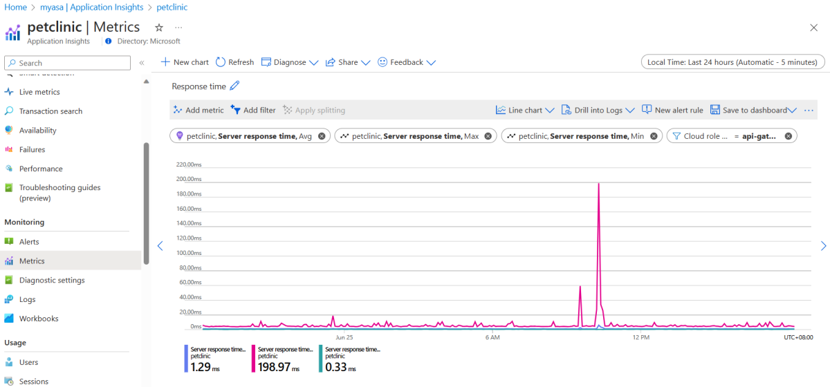 O Log Analytics e o Application Insights estão profundamente integrados aos Aplicativos Spring do Azure. Você pode usar o Log Analytics para diagnosticar seu aplicativo com várias consultas de log e usar o Application Insights para investigar problemas de produção. Para obter mais informações, consulte os seguintes artigos: