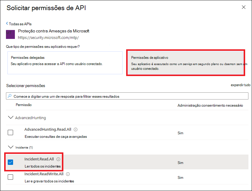 Incidents.Read.All,Incidents.ReadWrite.AlleAdvancedHunting.Read.Allpermissões: