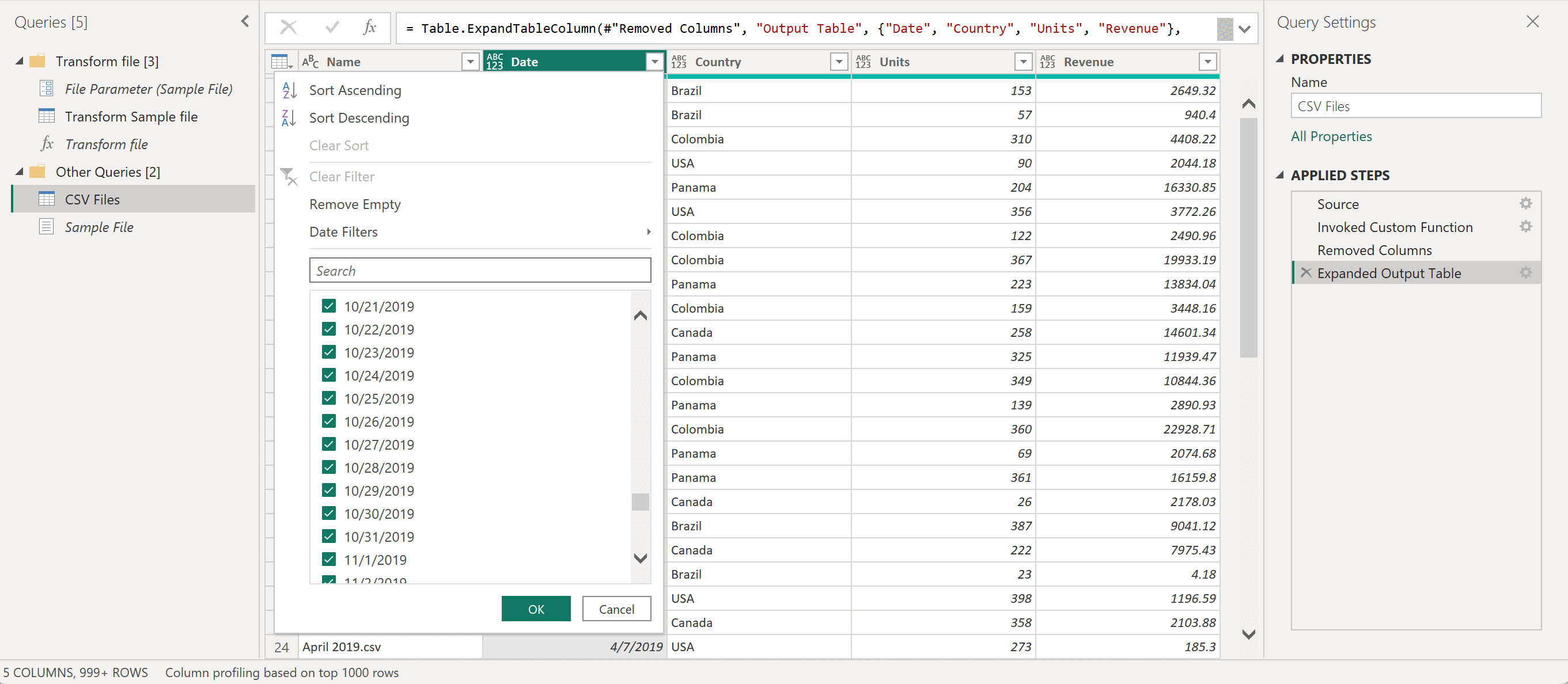 Agora você pode retornar à Tabela de Saída Expandida nas Etapas Aplicadas. Verifique sua consulta para validar que somente as linhas em que País é igual a Panamá aparecem no conjunto de resultados final da consulta Arquivos CSV.