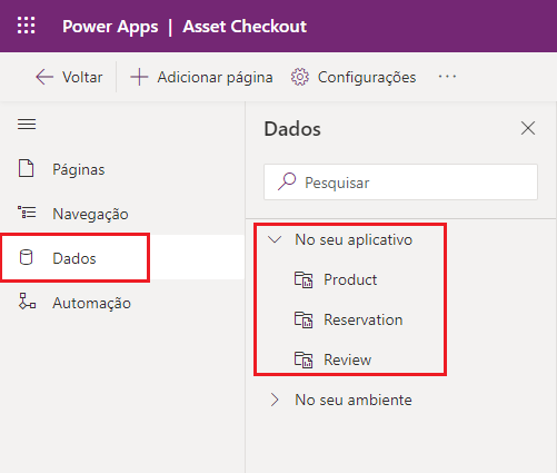 Considere o aplicativo Asset Checkout, que tem três tabelas de dados: Product, Reservation e Review.
