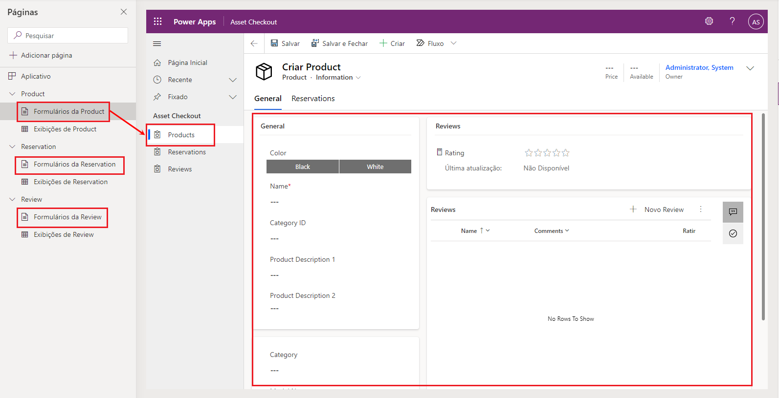 Essas três tabelas estabeleceram relacionamentos. Por exemplo, há um relacionamento muitos para um para a coluna Produto Associado entre a tabela Revisão e a tabela Produto.