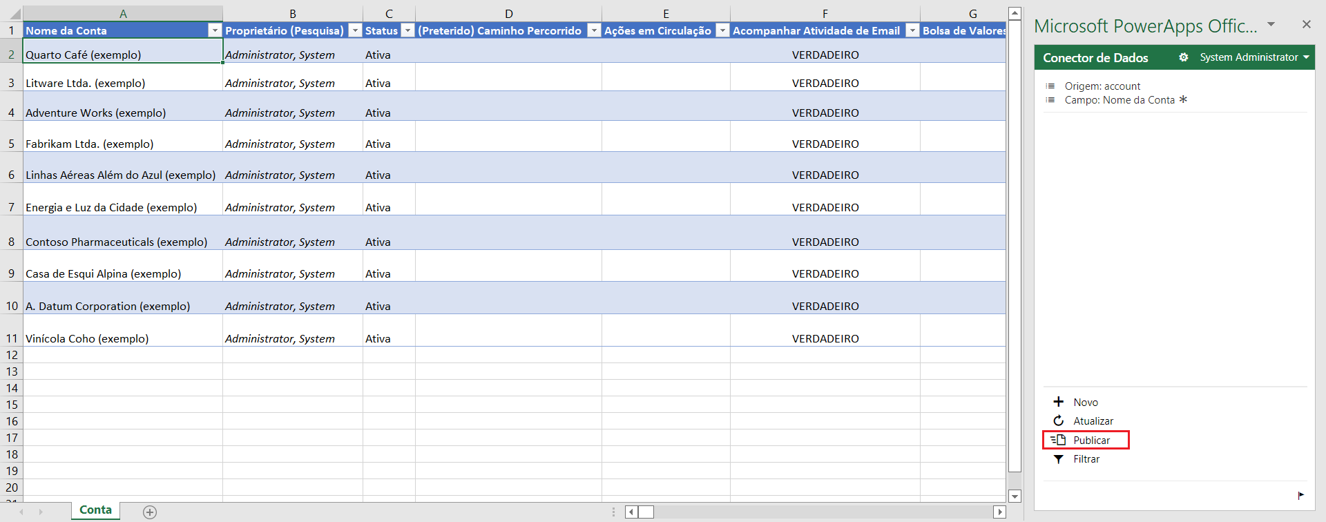 Após alguns instantes, os dados aparecerão na planilha e você poderá usar o Excel para adicionar, atualizar ou excluir dados usando os botões no painel de suplementos. O botão Publicar (no painel complementar) salva suas alterações.