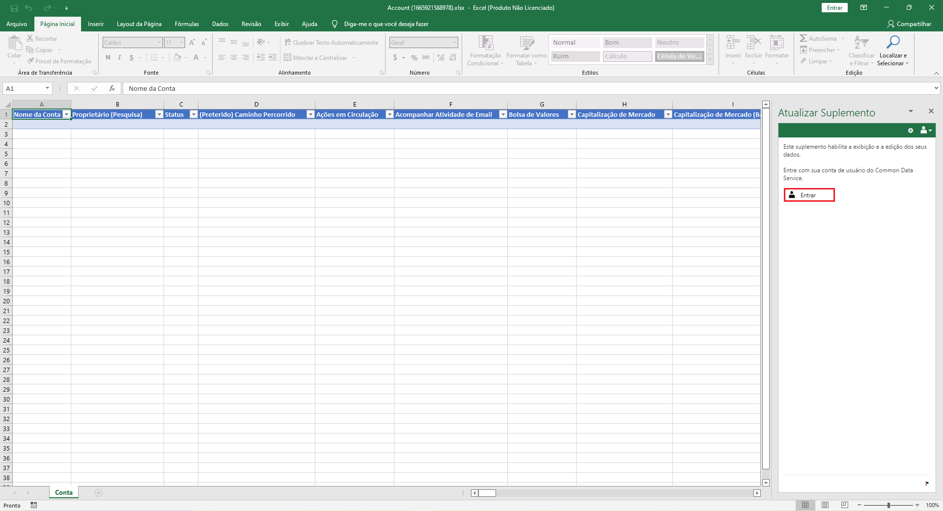 O Power Apps baixará o arquivo em Downloads do seu navegador, em que você pode abrir o arquivo no Excel online ou no aplicativo Excel. Ao abrir o arquivo, você será solicitado a Entrar para habilitar o Suplemento do Office do Microsoft Power Apps. Nenhum dos dados será exibido. Selecione Entrar.