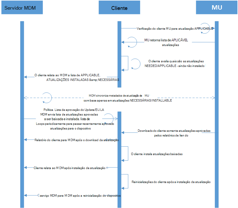 Um MDM pode gerenciar atualizações via OMA DM. Os detalhes de como usar e integrar um MDM com o protocolo Windows OMA DM e como registrar dispositivos para gerenciamento de MDM são documentados em Gerenciamento de dispositivos móveis. Essa seção destaca como estender essa integração para dar suporte ao gerenciamento de atualizações. Os principais aspectos do gerenciamento de atualizações incluem as seguintes informações: