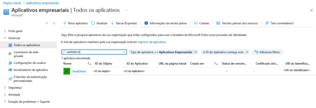 Substitua o valor do parâmetro assignee pelo ID da aplicação da identidade gerida do cofre. Para obter o valor do scope parâmetro, consulte seu contêiner específico. Para obter o ID do aplicativo da identidade gerenciada do cofre, selecione Todos os aplicativos em Tipo de aplicativo. Procure o nome do cofre e copie o valor ID da aplicação.