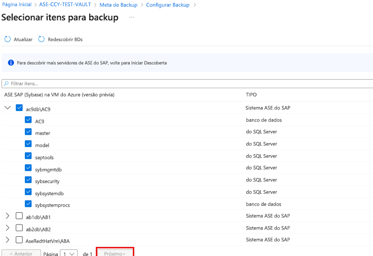 Em Selecionar itens para backup, selecione os Bancos de dados para proteção e, em seguida, selecione Avançar.