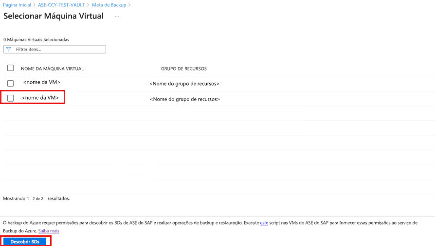 Depois de executar o script nas VMs, no painel Selecionar Máquinas Virtuais , selecione as VMs e, em seguida, selecione Descobrir DBs.
