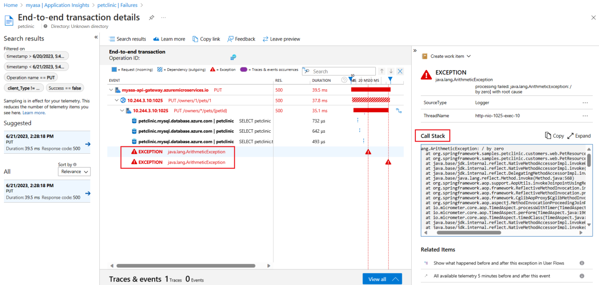 PUToperação com o maior número de solicitações com falha, selecione 1 Amostra para ver os detalhes e, em seguida, selecione a amostra sugerida.Vá para a página Detalhes da transação de ponta a ponta para visualizar a pilha completa de chamadas no painel direito.