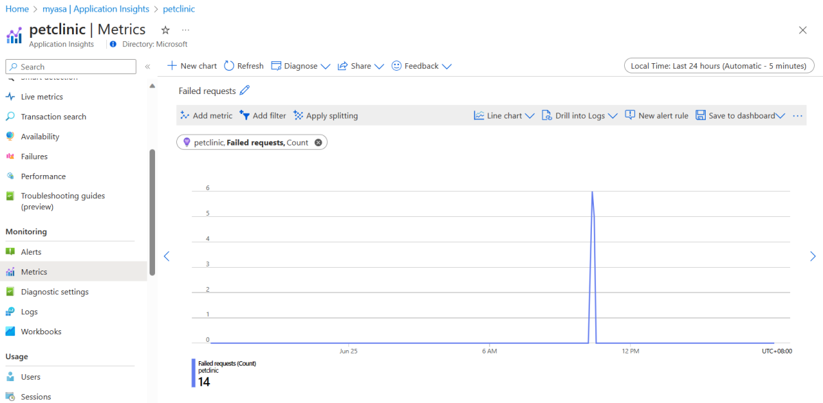 Para fixar o gráfico "Solicitações com falha", consulte as etapas da secção Fixar o gráfico "Disponibilidade". A métrica Solicitações com falha está sob o namespace de métricas padrão do Application Insights .