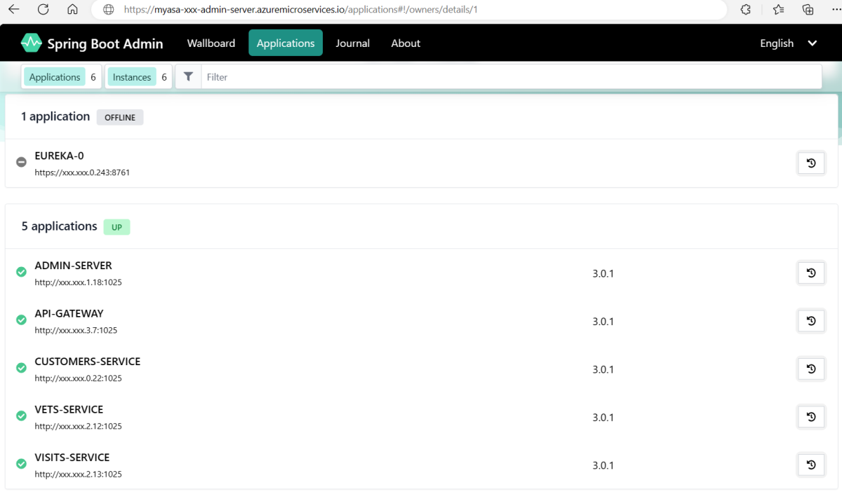 Abra a URL exposta pelo aplicativo admin-server para gerenciar os aplicativos por meio do Spring Boot Admin Server, conforme mostrado na captura de tela a seguir: