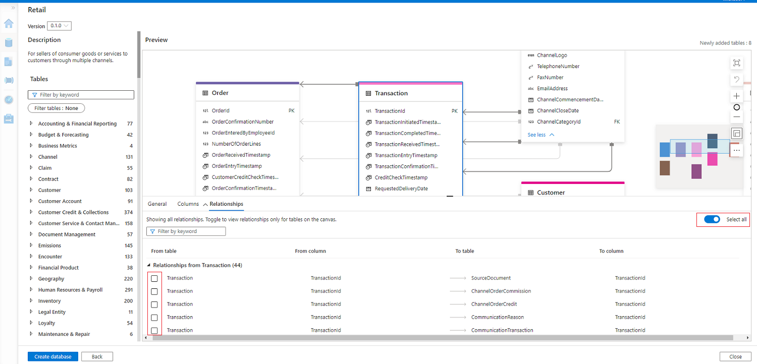 Você pode começar a personalizar tabelas, colunas e relações herdadas do modelo de banco de dados. Você também pode adicionar tabelas personalizadas, colunas, relacionamentos conforme necessário no banco de dados. Para obter mais informações sobre como modificar um banco de dados lake, consulte Modificar um banco de dados lake.