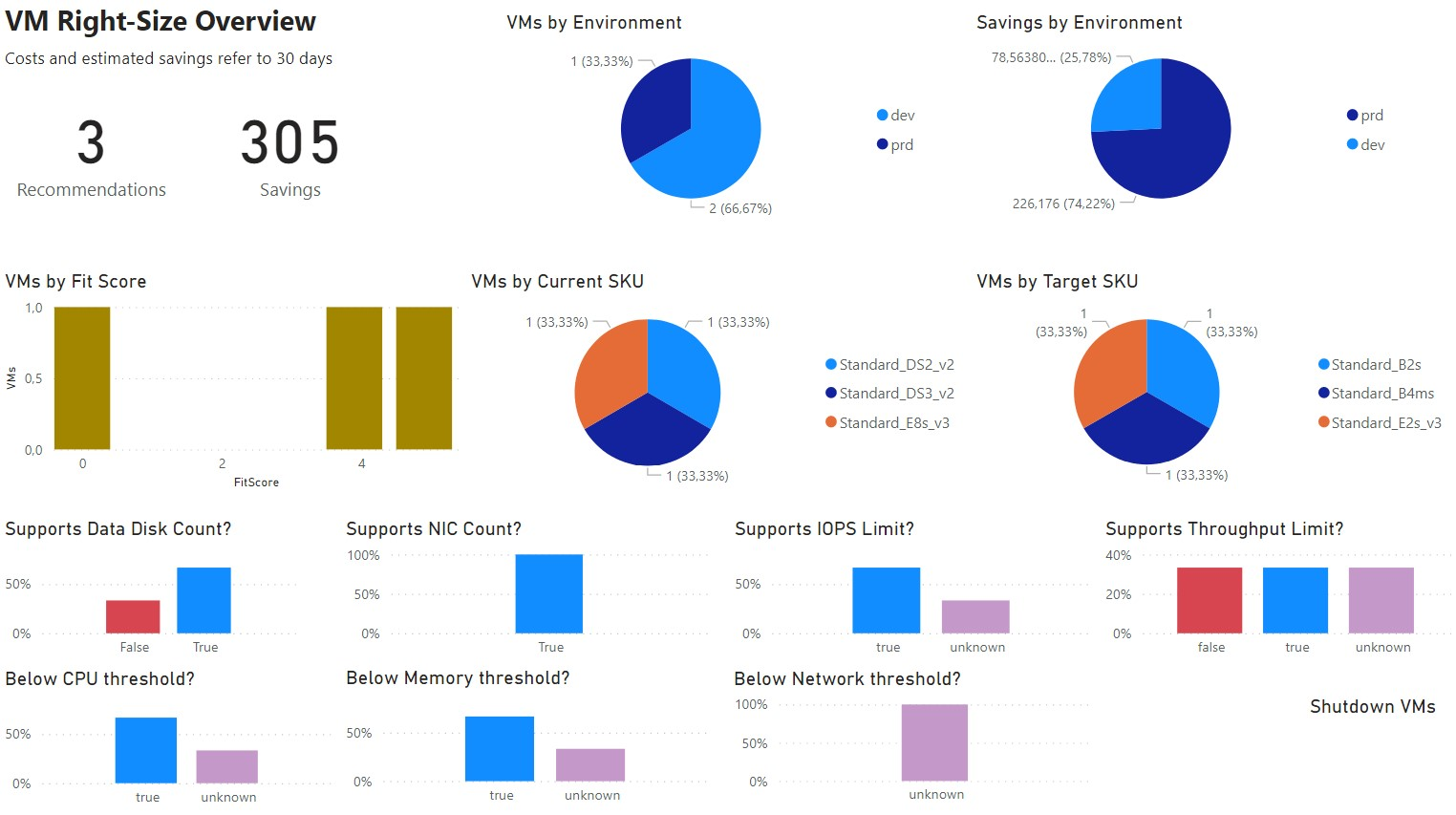 A Página de Visão Geral do Dimensionamento Adequado da VM fornece uma compreensão de alto nível da distribuição relativa das recomendações de dimensionamento adequado para máquinas virtuais (VM) do Azure Advisor. Podemos ver rapidamente como as características da carga de trabalho suportam as SKUs de tamanho ideal recomendadas. Se você tiver VMs enviando os contadores de desempenho necessários para o Log Analytics, terá uma visão mais clara sobre a capacidade de suporte de cada recomendação. No exemplo a seguir, temos algumas informações desconhecidas, já que uma das VMs não enviou métricas de desempenho para o espaço de trabalho do Log Analytics.